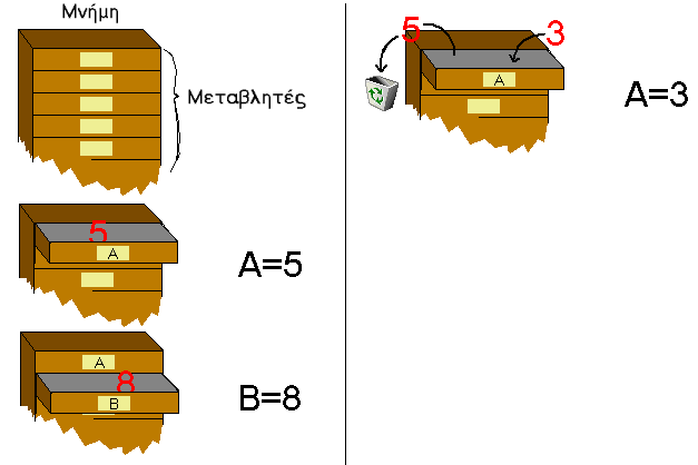 Φανταστήτε την μνήμη του Η/Υ σας, σαν ένα τεράστιο έπιπλο απο συρτάρια. Κάθε ένα απο τα συρτάρια είναι μια μεταβλητή. Η εττικέτα έξω απο το συρτάρι είναι το όνομα της μεταβλητής, ενώ μέσα στο συρτάρι αποθηκεύουμε την τιμή της μεταβλητής.